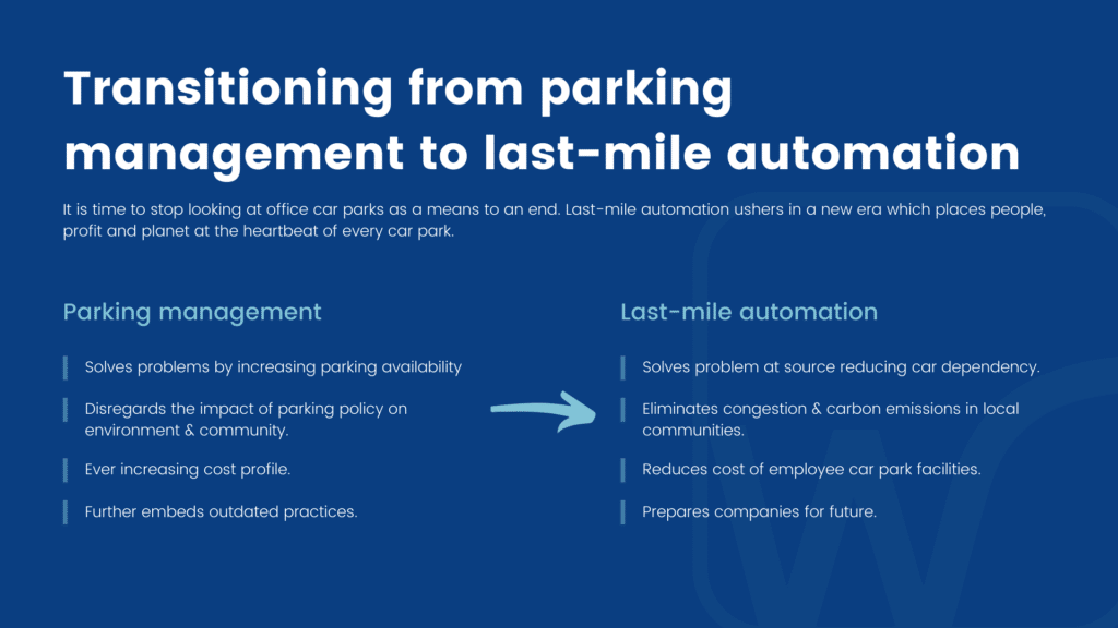 Last mile automation was a concept coined by Wayleadr in 2022. Frustrated by the short-term approach of many businesses when it came to solving parking challenges, the Wayleadr team embarked on building a framework that would deliver the results businesses and employees need while also delivering for local communities and the planet.